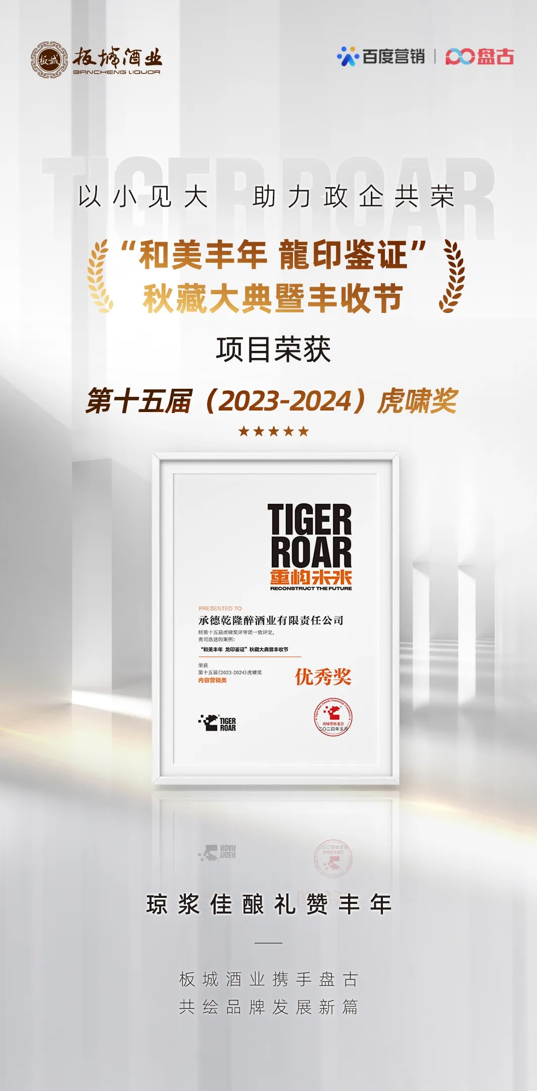 近日,第十五屆虎嘯獎(jiǎng)?lì)C獎(jiǎng)典禮在上海舉辦,承德乾隆醉酒業(yè)有限責(zé)任公司憑借「“和美豐年龍印鑒證”秋藏大典暨豐收節(jié)」案例,以優(yōu)異的內(nèi)容營(yíng)銷創(chuàng)意、資源整合能力及出色的營(yíng)銷效果,從1020家優(yōu)秀企業(yè)提交的4505件參賽作品中脫穎而出,榮獲第十五屆(2023-2024)虎嘯獎(jiǎng)內(nèi)容營(yíng)銷類優(yōu)秀獎(jiǎng)。
